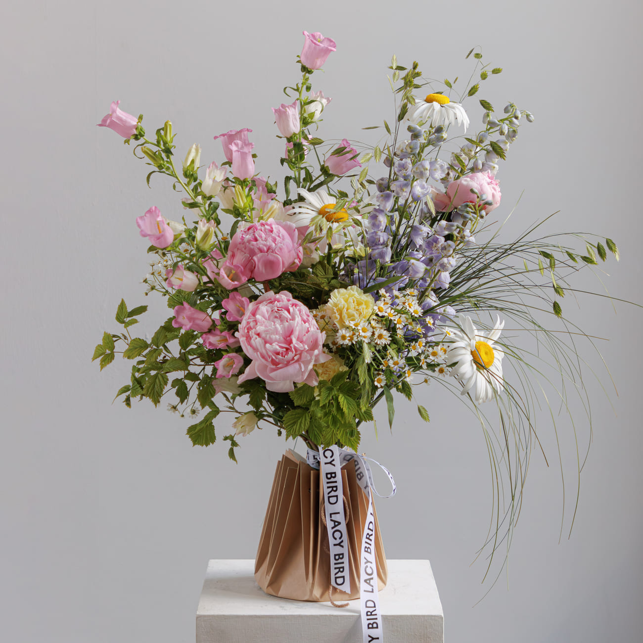 The fresh flowers from Lacy Bird are delivered in original packaging. Remove the packaging and place the flowers in a vase. We recommend not cutting the ribbon tying the flowers to keep the shape of the bouquet.