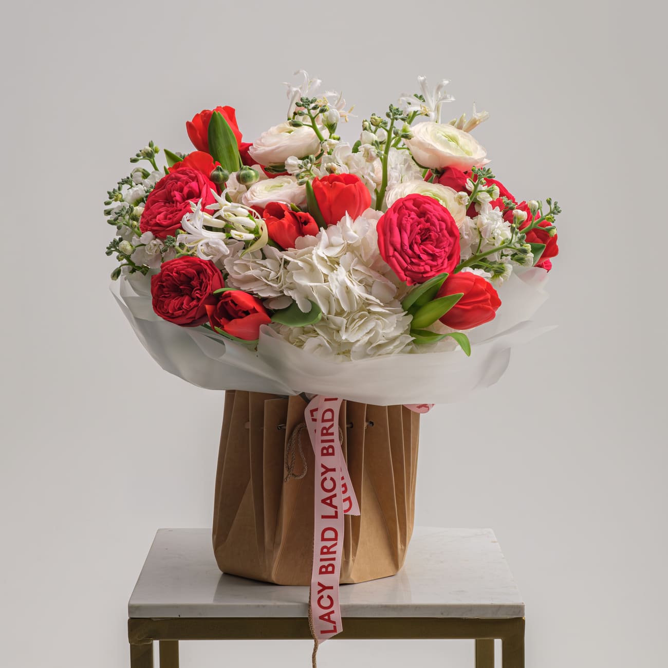 The fresh flowers from Lacy Bird are delivered in original packaging. Remove the packaging and place the flowers in a vase. We recommend not cutting the ribbon tying the flowers to keep the shape of the bouquet.