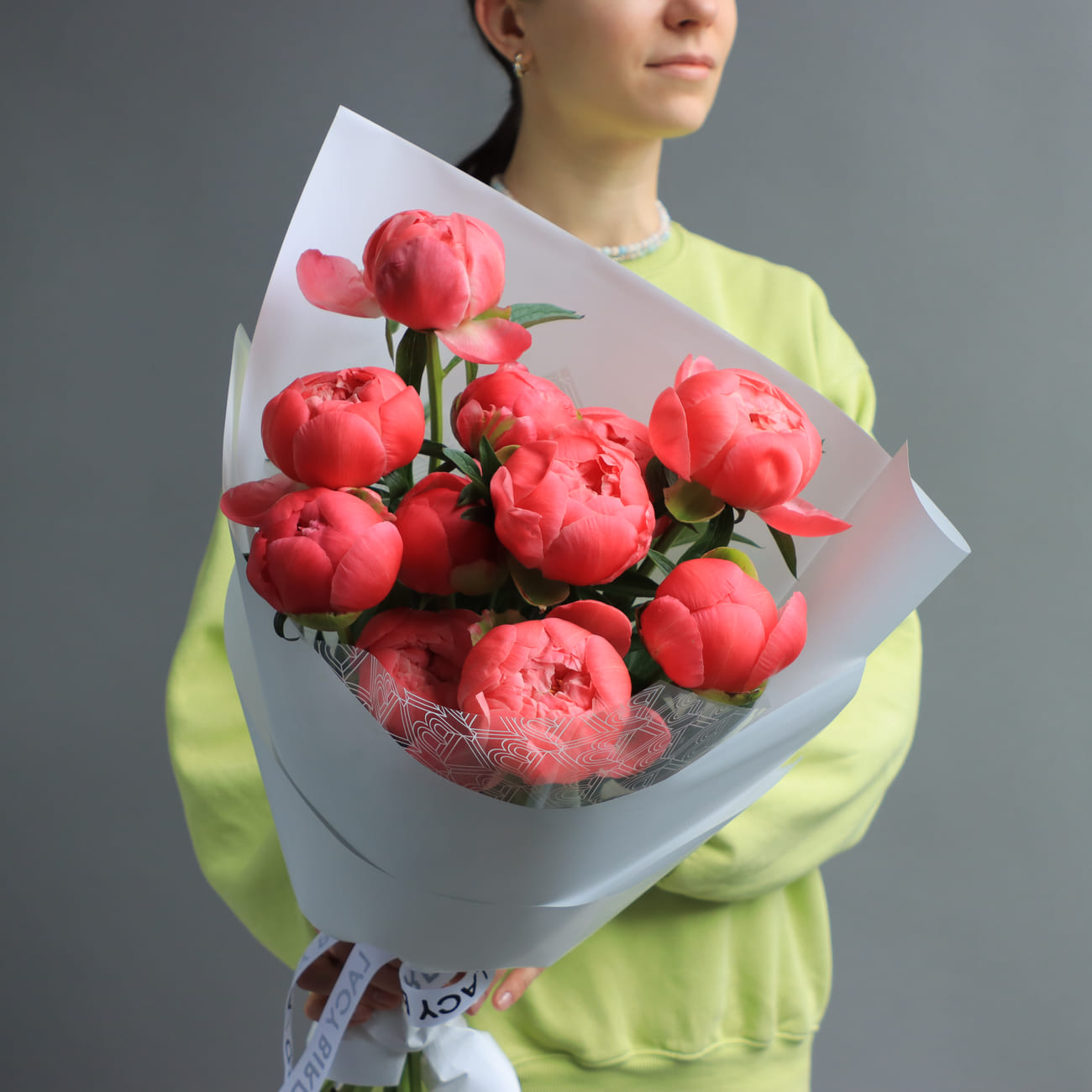 Погрузитесь в атмосферу солнечного лета с монобукетом пионов сорта "Coral Charm". Эти свежие, волшебные пионы впечатляют своими крупными, коралловыми бутонами, их особенность заключается в том, что оттенок бутонов меняется из ярко-алого в нежно-белый под воздействием света и тепла. Их нежные и пышные лепестки создают атмосферу праздника и уюта.