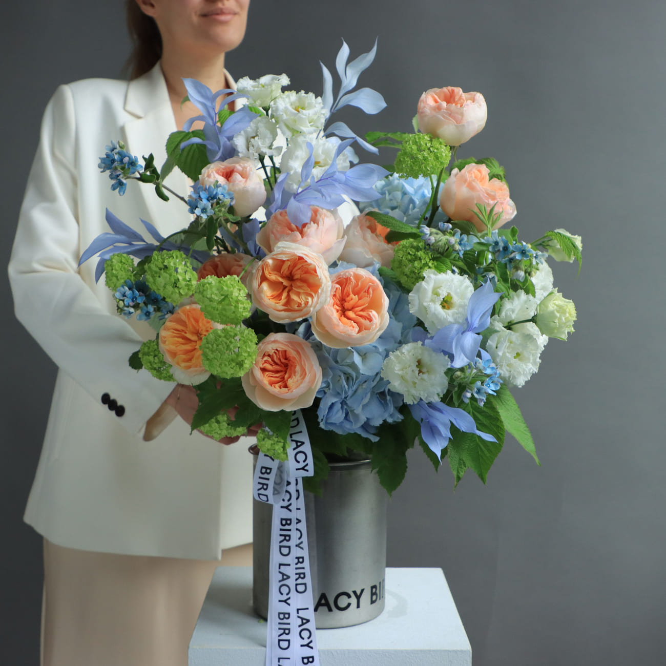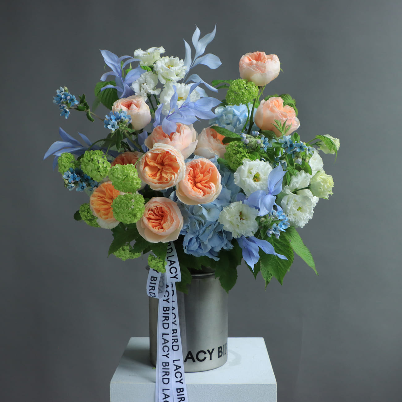 The fresh flowers from Lacy Bird are delivered in original packaging. Remove the packaging and place the flowers in a vase. We recommend not cutting the ribbon tying the flowers to keep the shape of the bouquet.