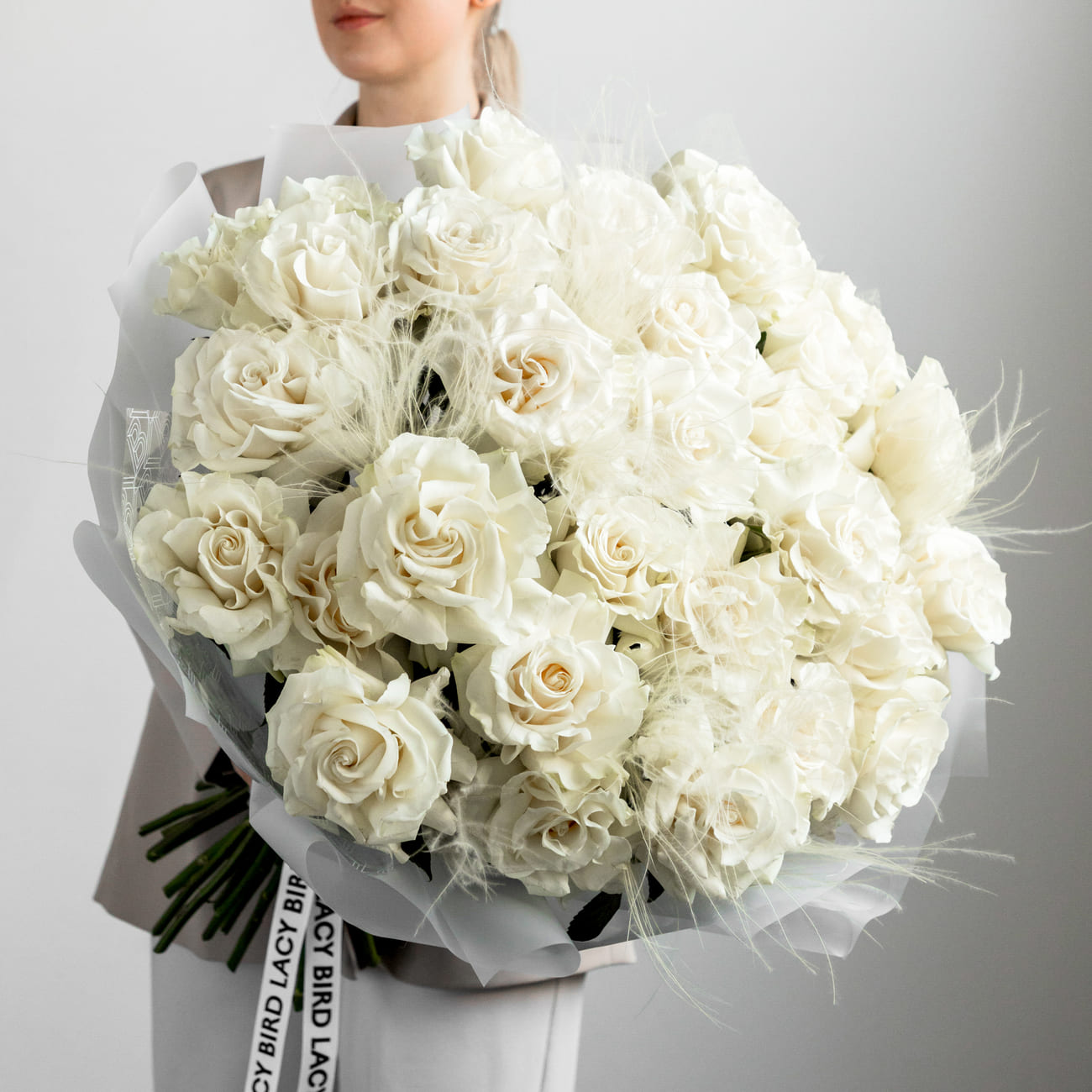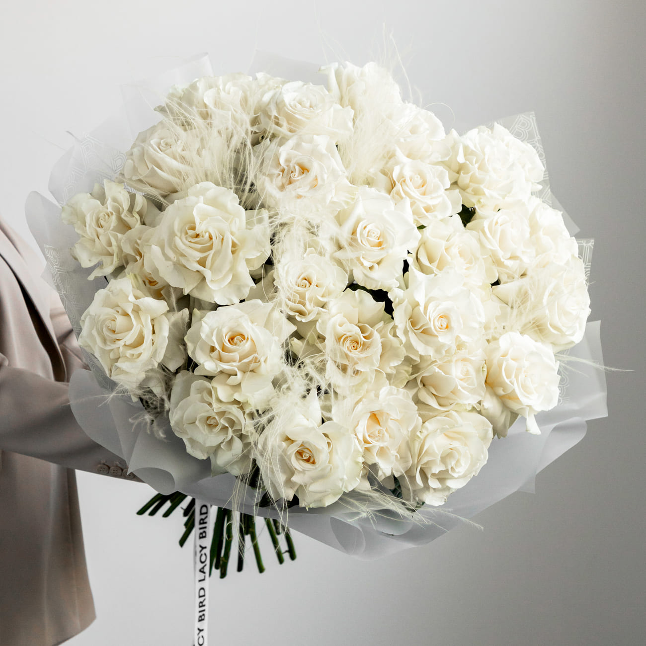 The fresh flowers from Lacy Bird are delivered in original packaging. Remove the packaging and place the flowers in a vase. We recommend not cutting the ribbon tying the flowers to keep the shape of the bouquet.