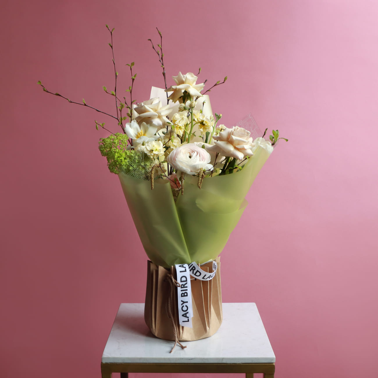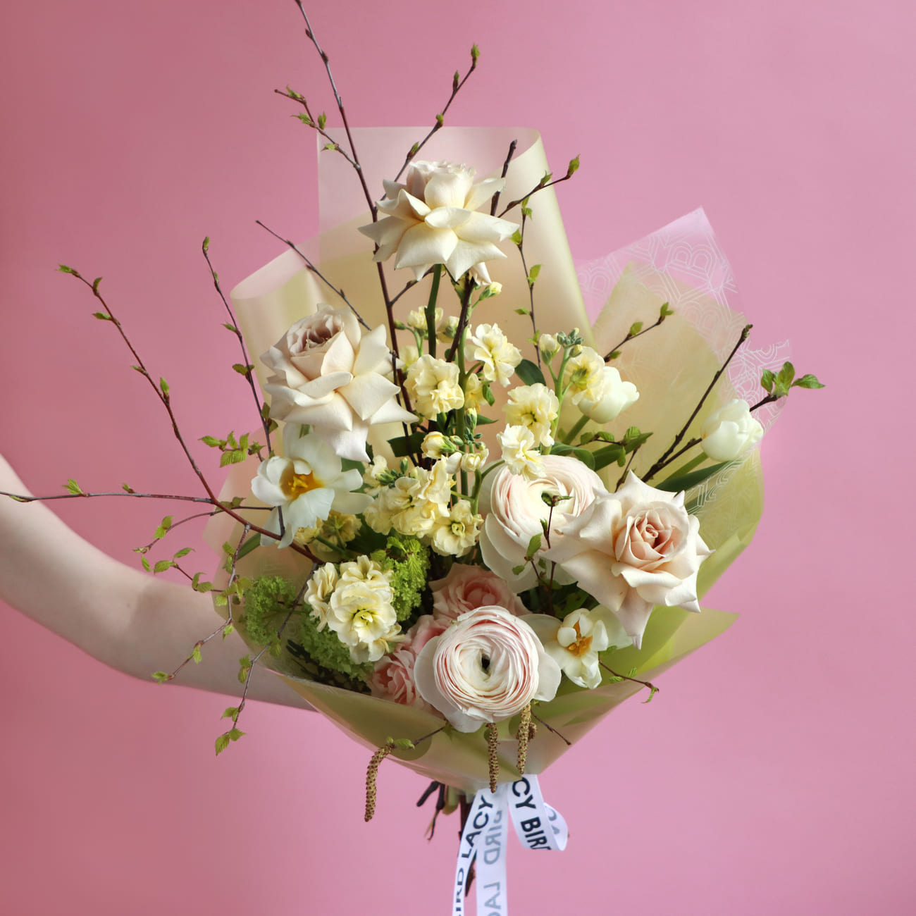 The fresh flowers from Lacy Bird are delivered in original packaging. Remove the packaging and place the flowers in a vase. We recommend not cutting the ribbon tying the flowers to keep the shape of the bouquet.