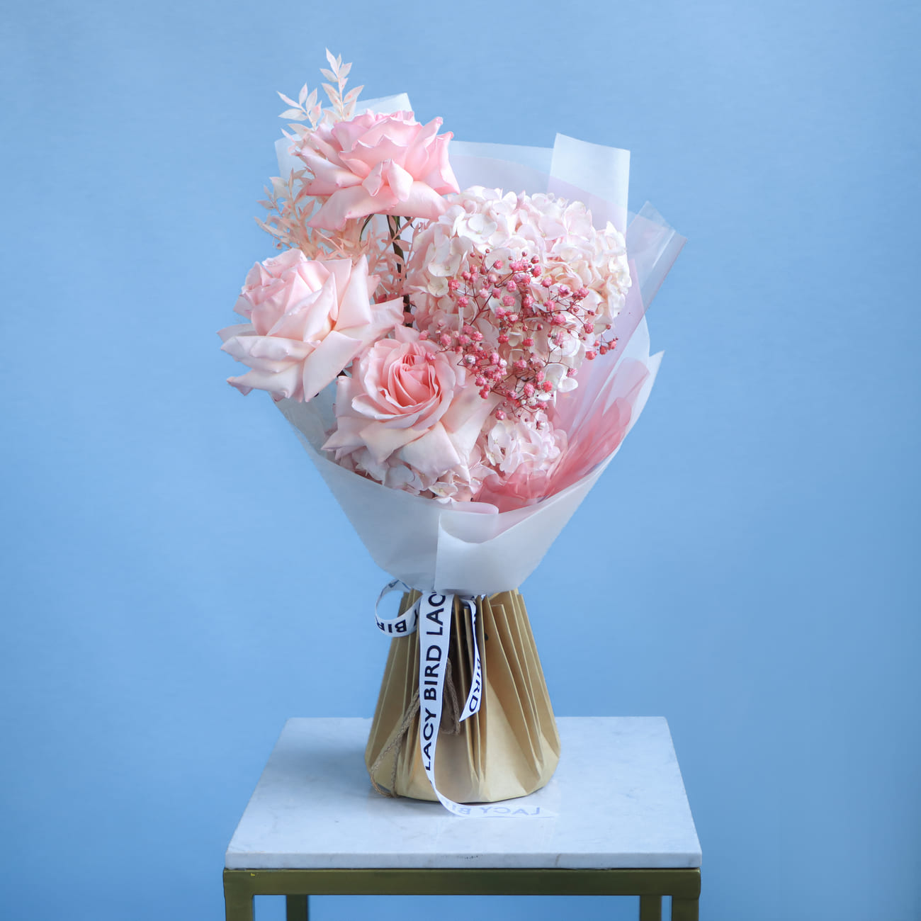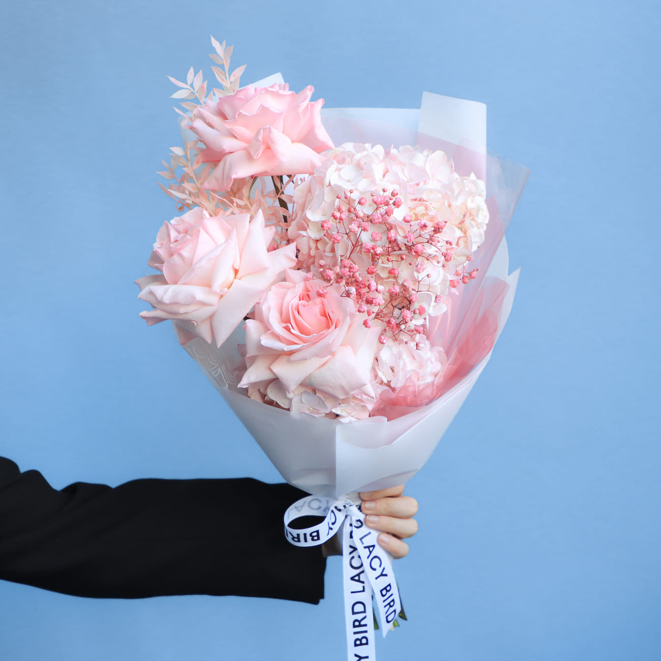 The fresh flowers from Lacy Bird are delivered in original packaging. Remove the packaging and place the flowers in a vase. We recommend not cutting the ribbon tying the flowers to keep the shape of the bouquet.