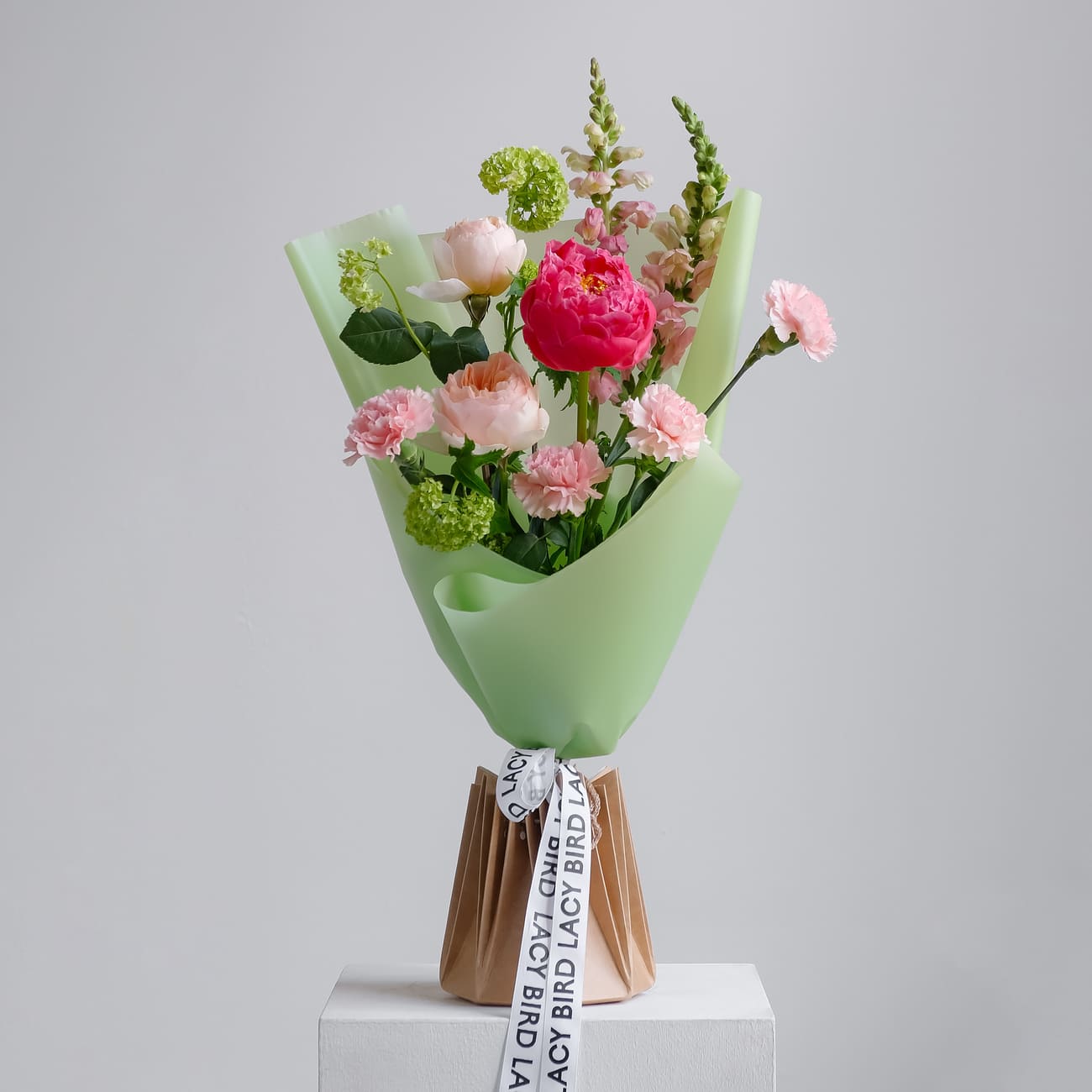 The fresh flowers from Lacy Bird are delivered in original packaging. Remove the packaging and place the flowers in a vase. We recommend not cutting the ribbon tying the flowers to keep the shape of the bouquet.