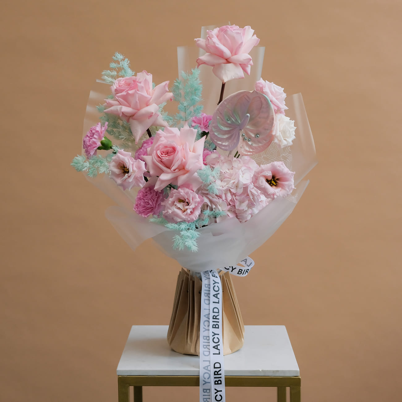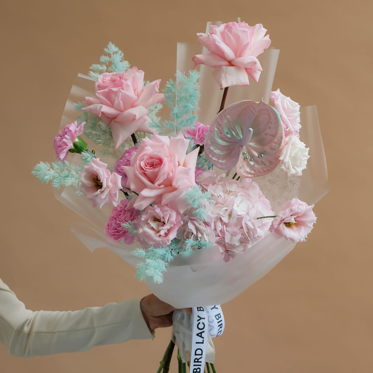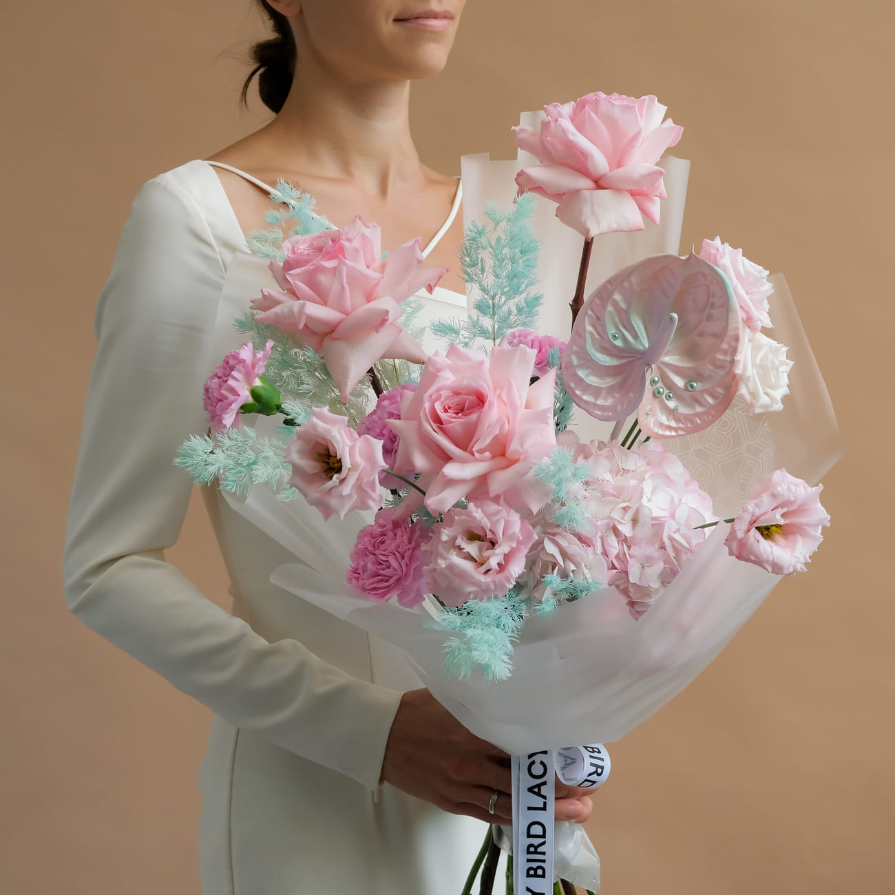 The fresh flowers from Lacy Bird are delivered in original packaging. Remove the packaging and place the flowers in a vase. We recommend not cutting the ribbon tying the flowers to keep the shape of the bouquet.