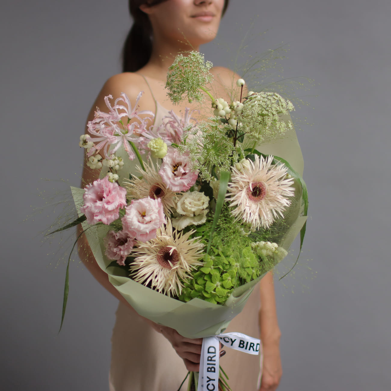 The fresh flowers from Lacy Bird are delivered in original packaging. Remove the packaging and place the flowers in a vase. We recommend not cutting the ribbon tying the flowers to keep the shape of the bouquet.