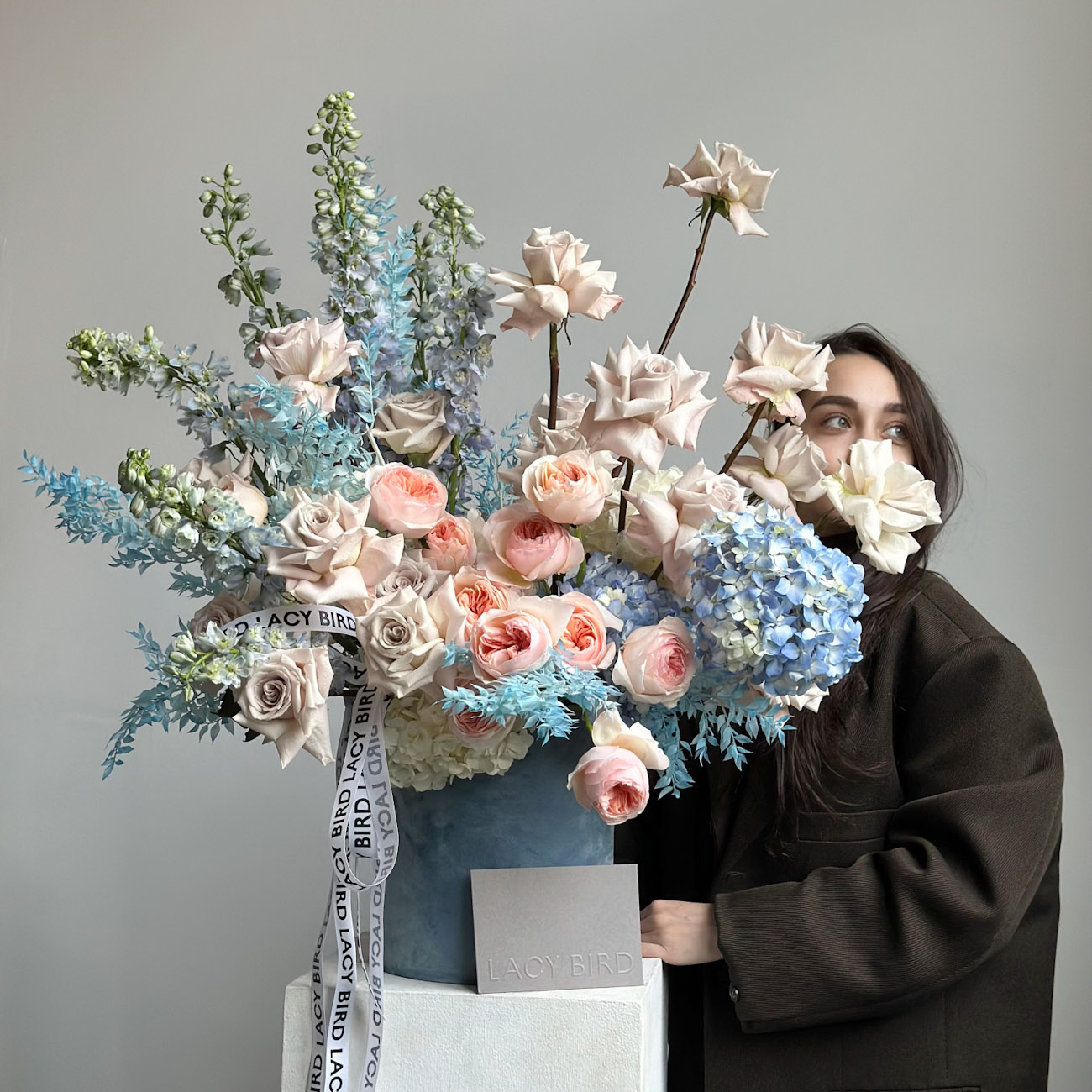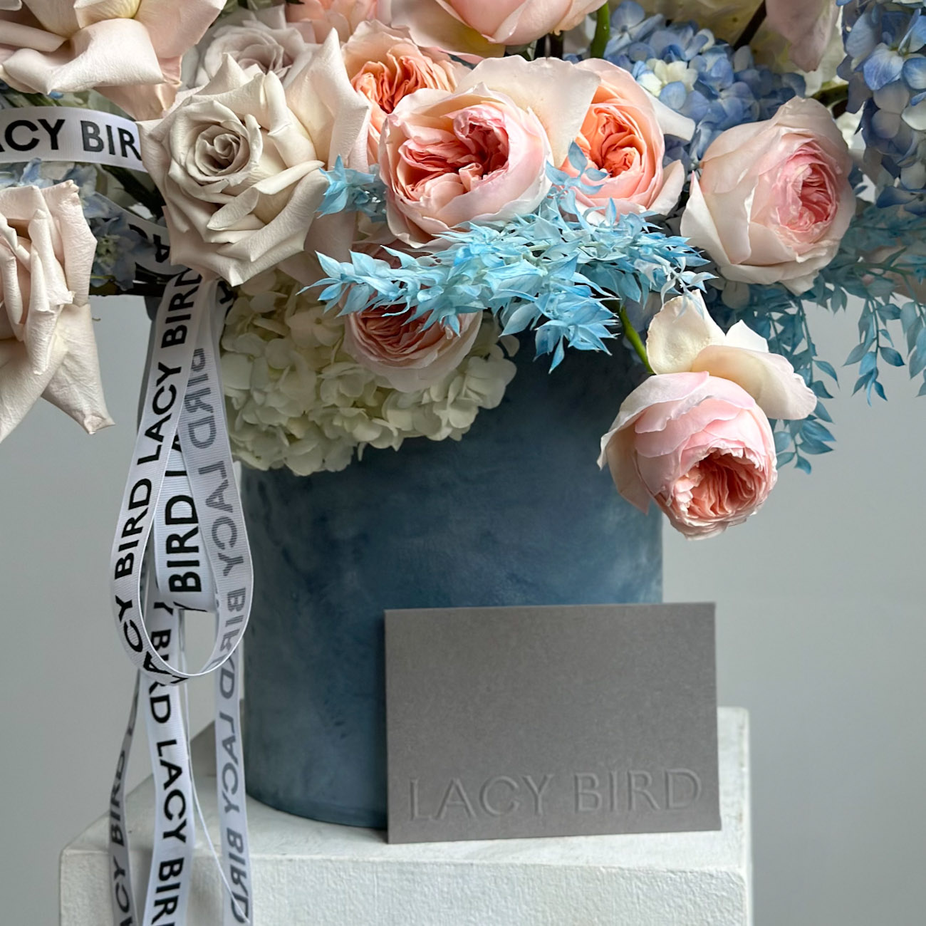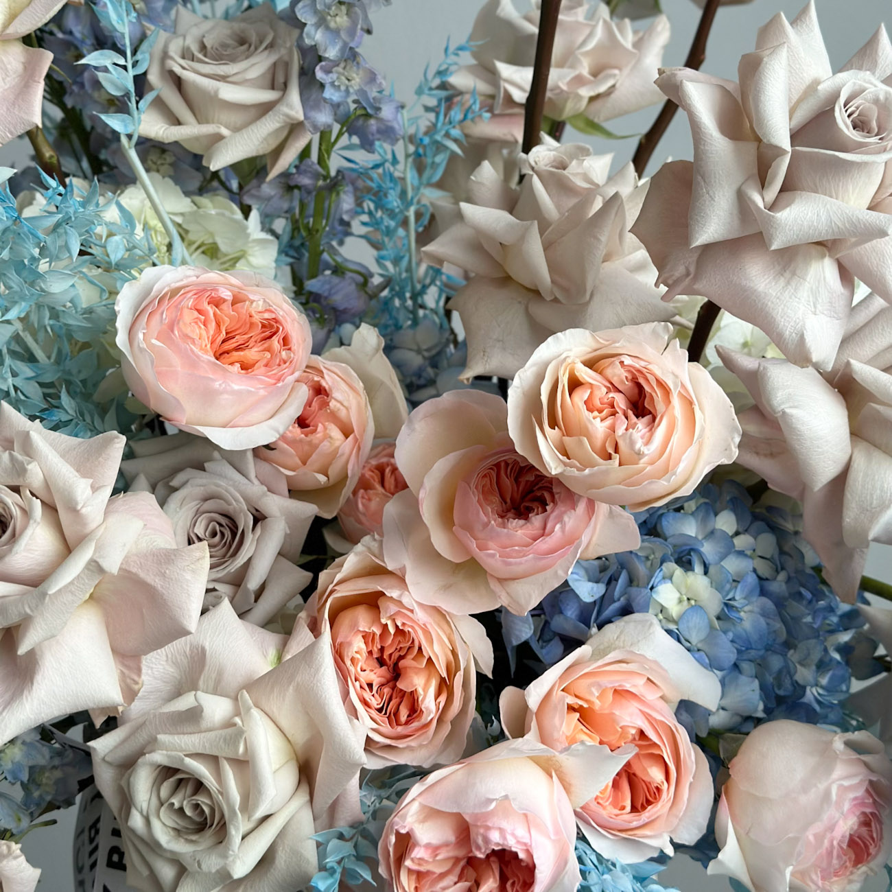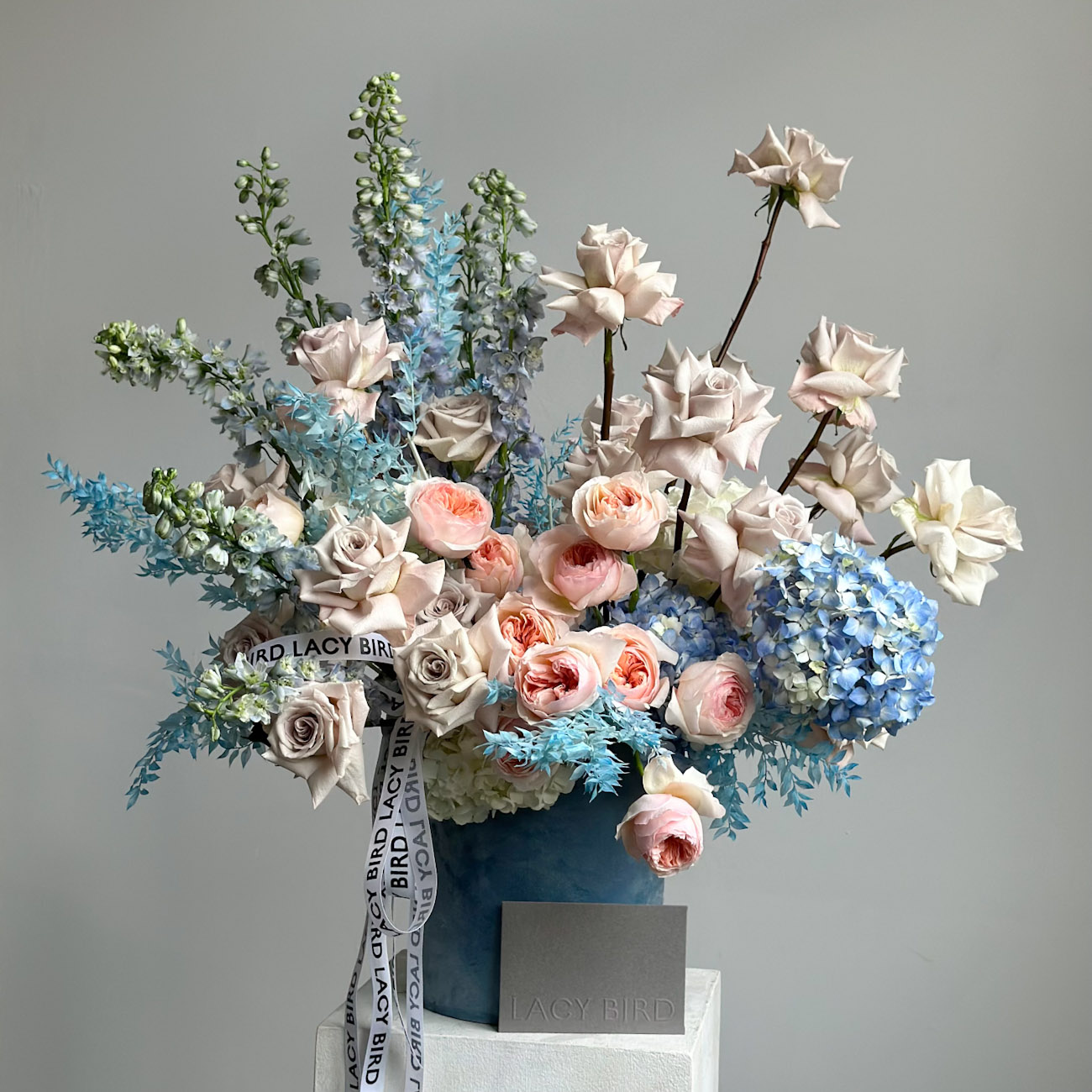 Погрузитесь в необыкновенный мир "Кораллового рифа" — уникальной композиции в стильной коробке. Пышные розы нежных оттенков, голубые гортензии и изысканные дельфиниумы создают яркое и романтичное настроение.