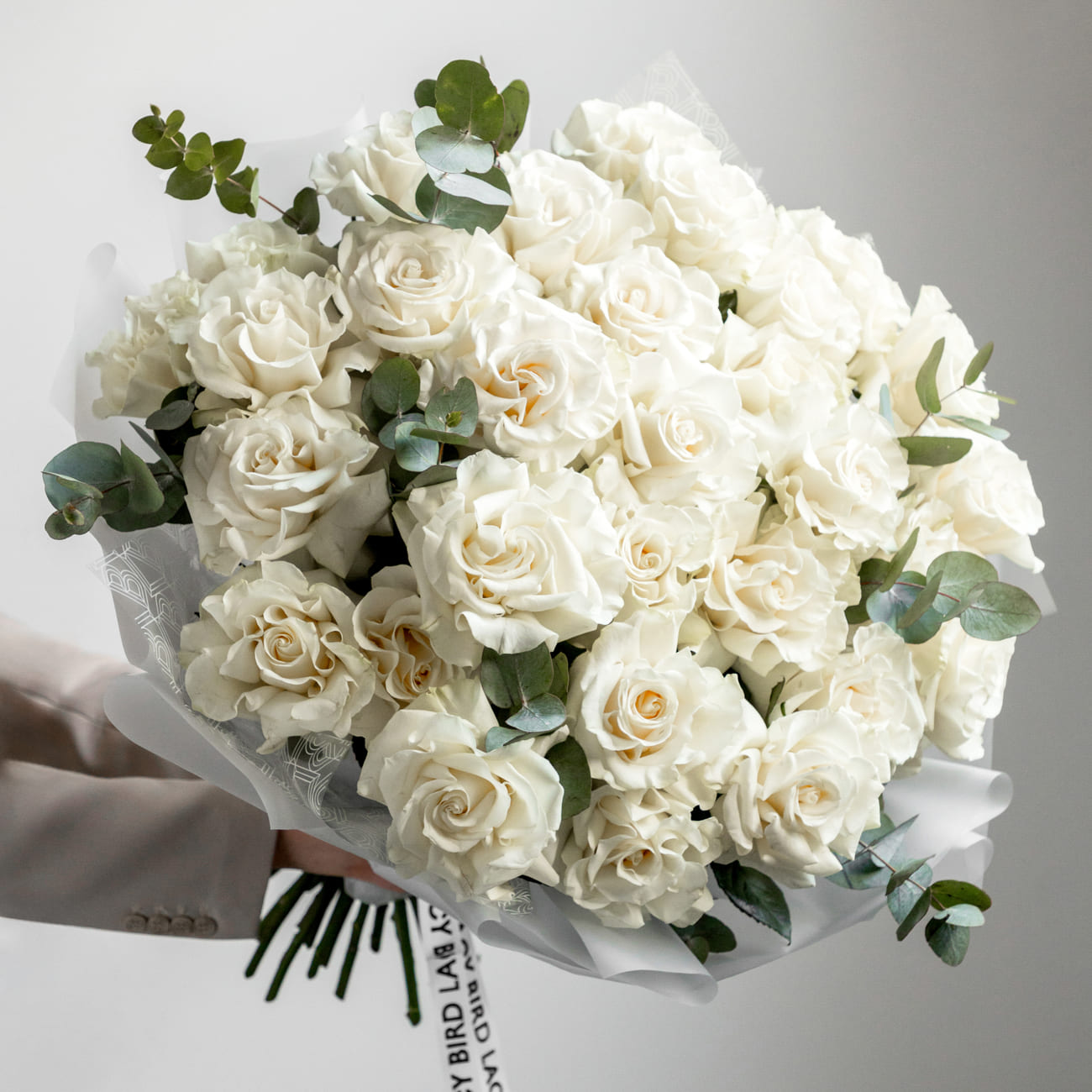 Монобукет из французской розы Playa Blanca с эвкалиптом