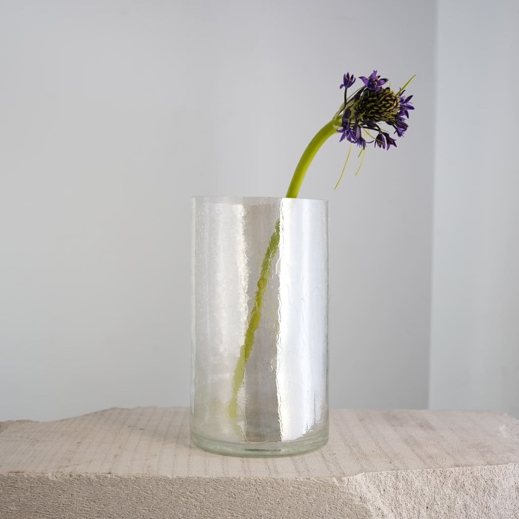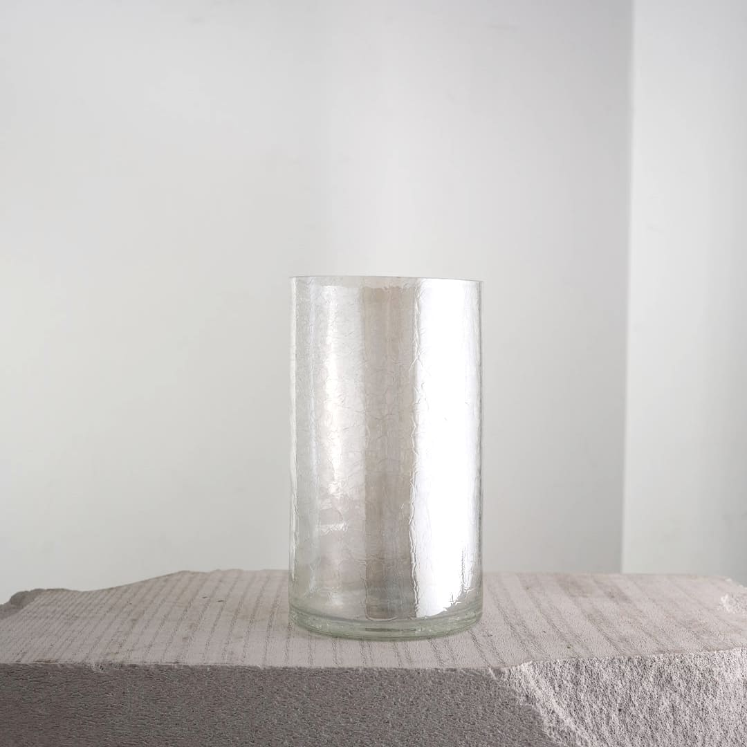 Эта ваза собрана словно из битого стекла. Осколки контрастируют с чёткими линиями, создавая баланс между хаосом и гармонией. Прозрачные фрагменты играют светом, добавляя динамики даже без наполнения.