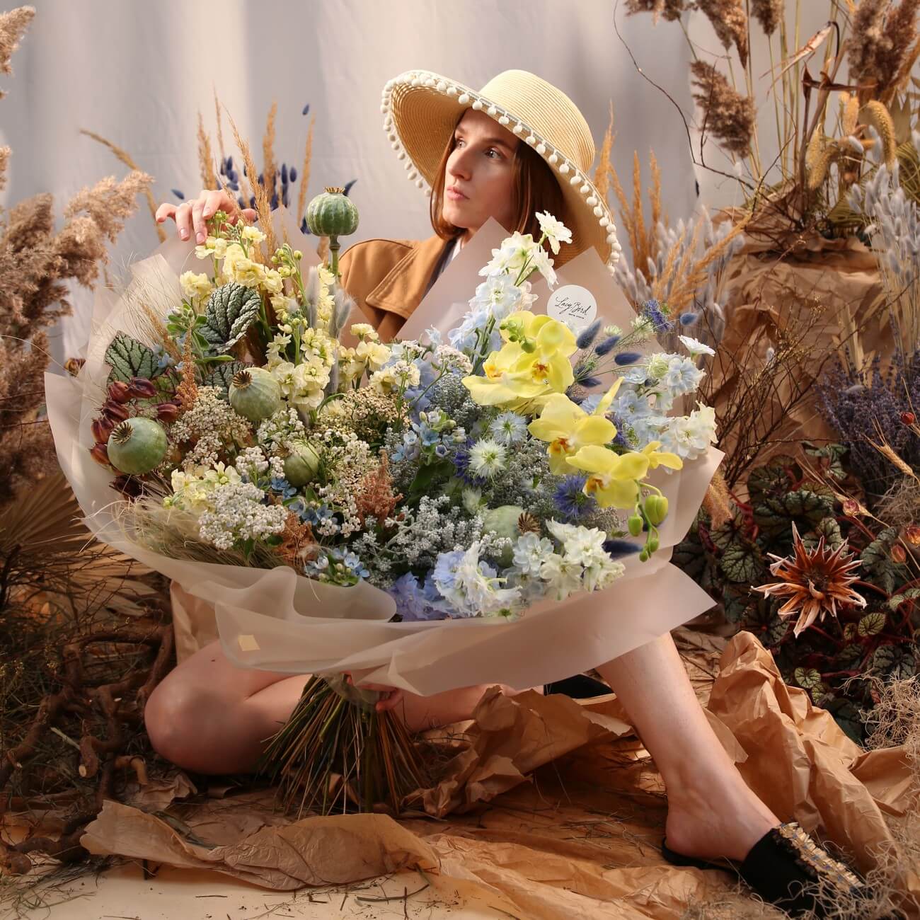 The fresh flowers from Lacy Bird are delivered in original packaging. Remove the packaging and place the flowers in a vase. We recommend not cutting the ribbon tying the flowers to keep the shape of the bouquet.